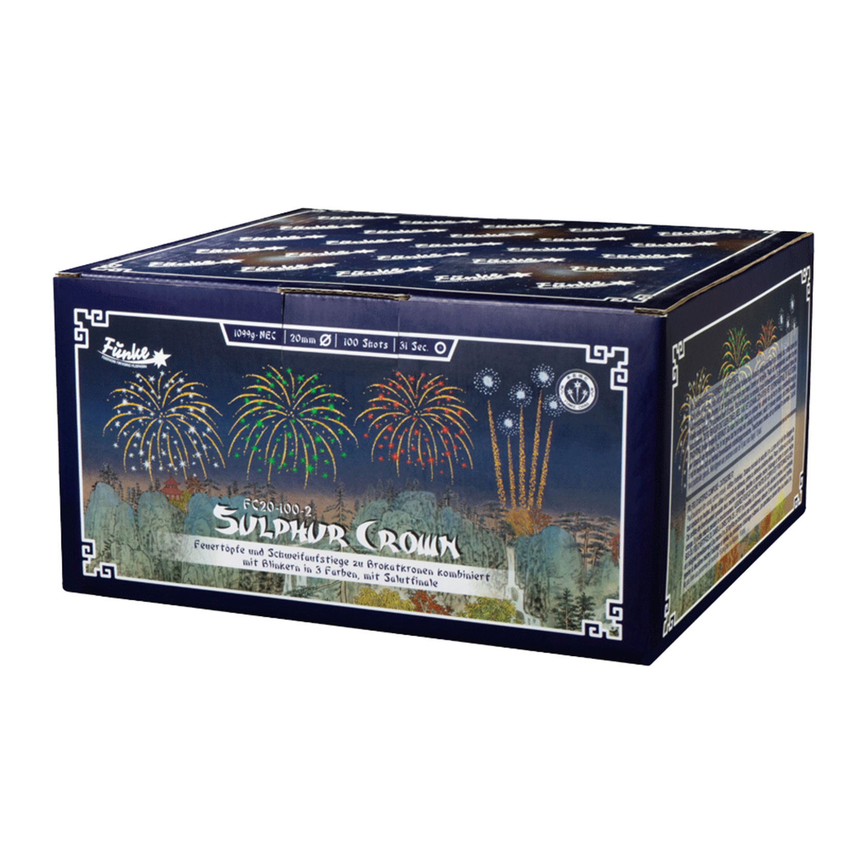 Schneller 100 Schuss Verbund im Kaliber 20mm, mit Feuertöpfen und Schweifaufstiegen zu Brokatkronen kombiniert mit Blinkern in 3 Farben, mit Salutfinale.