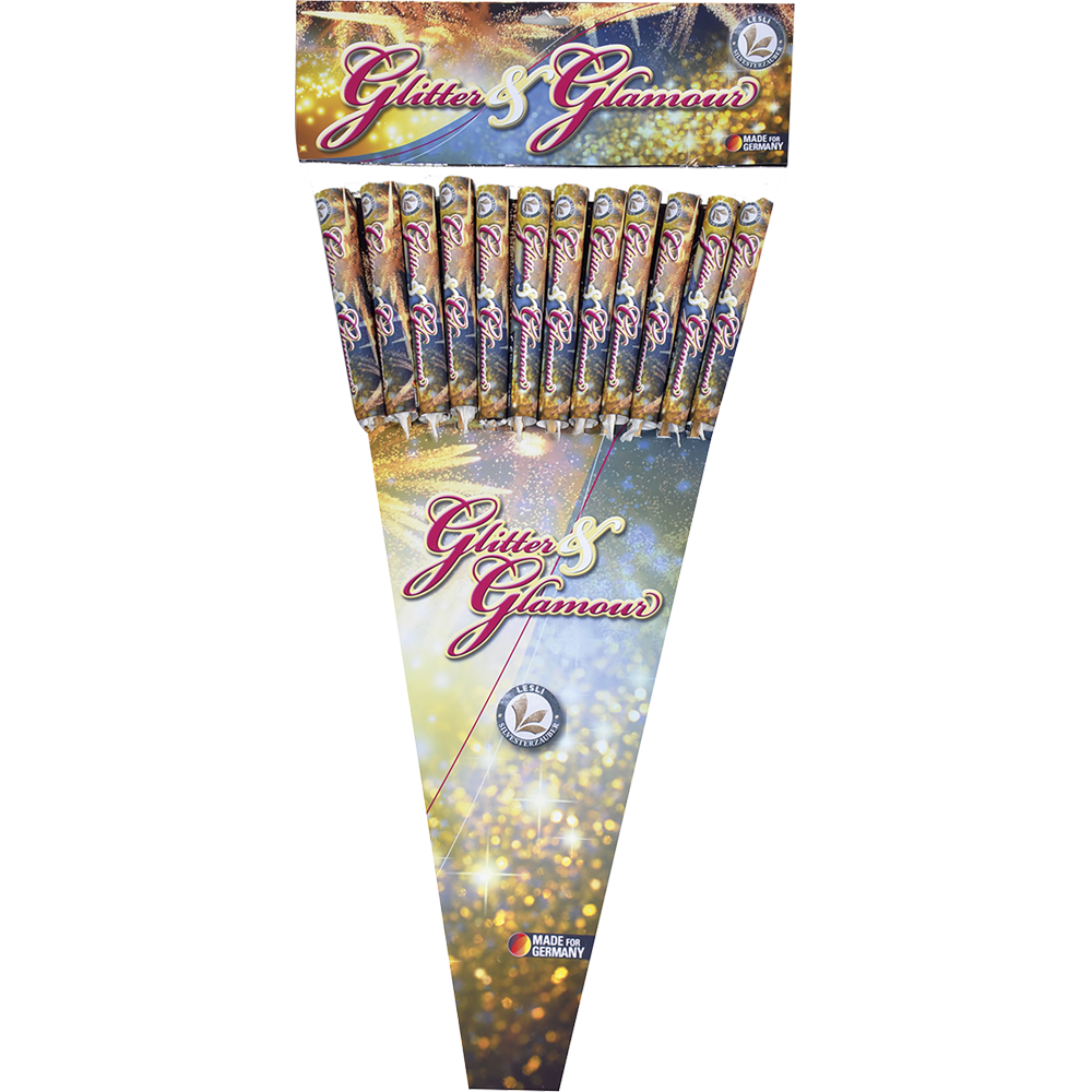 12 vuurpijlen met flitsgranaten en krachtige effecten in de kleuren rood, groen, blauw en paars.