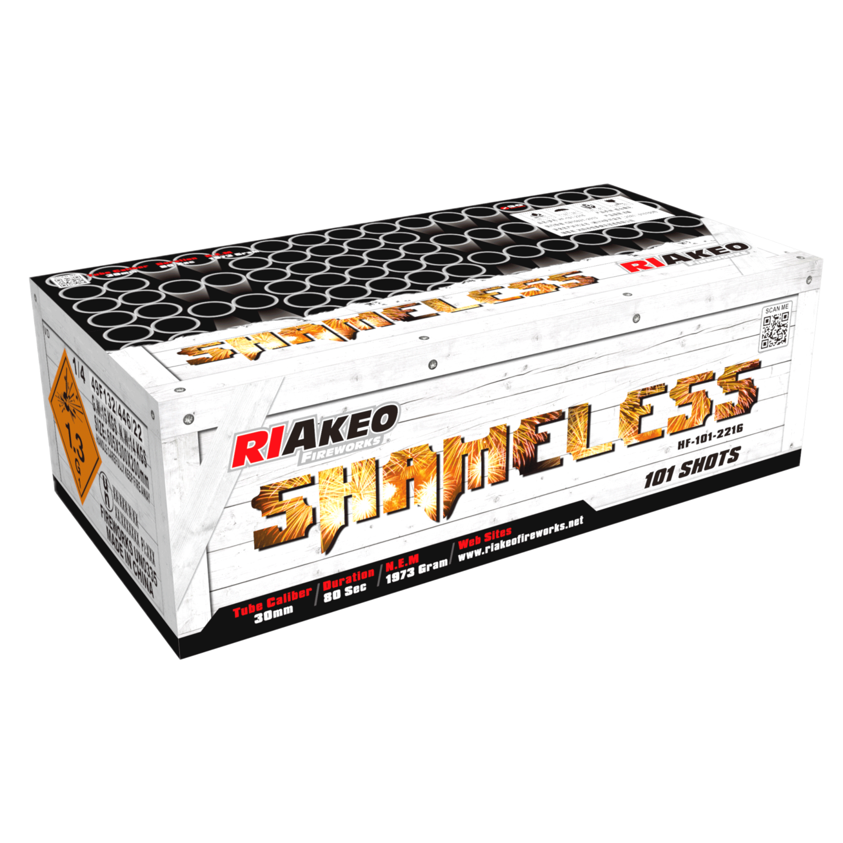 Die Riakeo Shameless ist ein beeindruckendes Verbundfeuerwerk des Herstellers Riakeo Fireworks, das sich durch seine kraftvollen Effekte und abwechslungsreichen Schussfolgen auszeichnet. Mit 101 Schuss aus 30 mm Kaliberrohren und einer Nettoexplosivmasse (NEM) von 1973 g bietet sie eine spektakuläre Show über eine Dauer von etwa 75 bis 80 Sekunden.